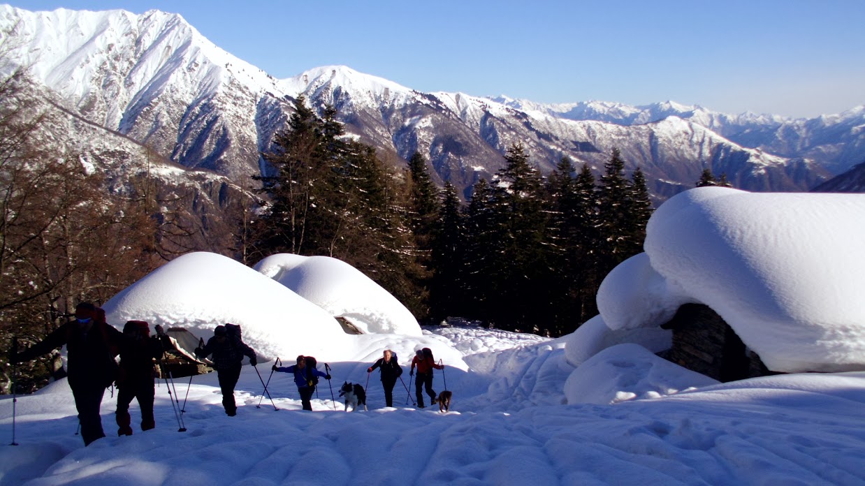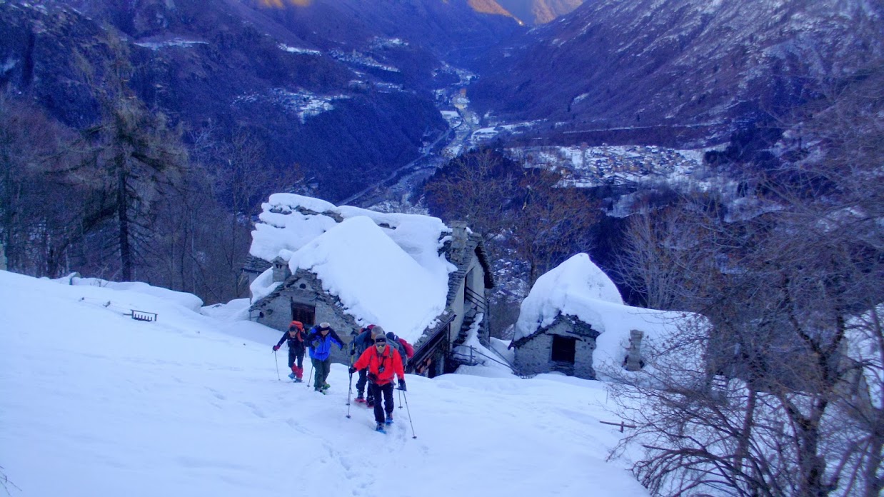 Il Pizzetto è una meta stupenda, sia d’estate che d’inverno. Inoltre, non presenta pericoli neppure in periodi di grande innevamento e di elevato rischio valanghe. Si svolge interamente nel bosco, su una bellissima dorsale che separa valle Anzasca e valle Olocchia. Va bene per ciaspolatori e sciatori. Lo sviluppo è notevole rispetto al dislivello e l’escursione, pur lunga, non è particolarmente faticosa. Naturalmente, in inverno, richiede un buon allenamento, soprattutto per gli sciatori, perché la discesa può essere più faticosa della salita. Oggi il tempo è stupendo, finalmente! Siamo in undici: cinque con sci e sei con ciaspole.