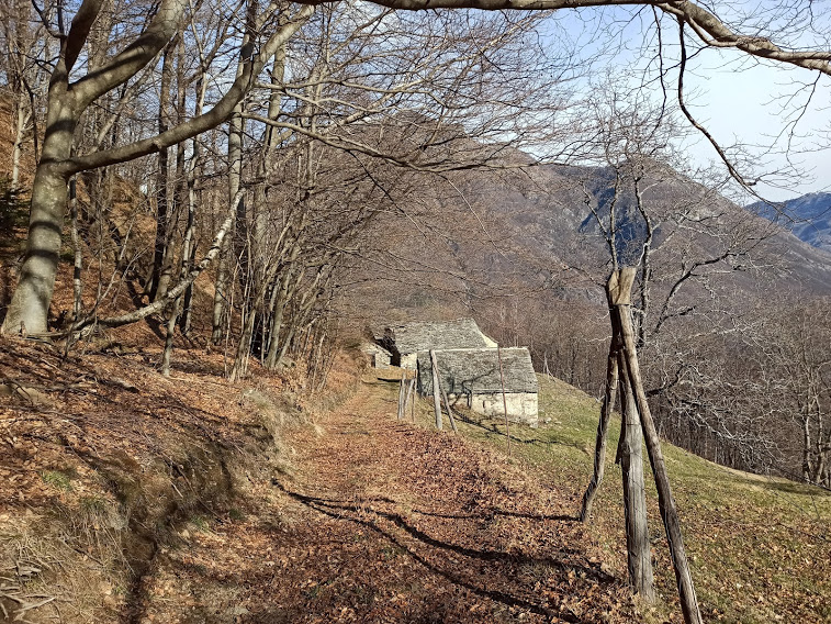 A quota 550 si incontra una cappella. Il sentiero/mulattiera è sempre evidente. Attraversiamo due vallette e incrociamo il sentiero che sale da Motto. Saliamo ancora ed ecco il sentiero che proviene da Andosso. A sinistra, quasi in piano, arriviamo a Vallesone, 665. Aldilà della strada altro sentiero. Ci teniamo sempre a destra lungo una scorciatoia piuttosto ripida che ci risparmia il tratto di asfalto e ci riporta direttamente sulla pista trattorabile che s’imboccherebbe dopo il tornante della strada provinciale per il Lusentino. Seguiamo la pista, lasciando alla nostra sinistra il bivio per Domobianca, e, dopo aver attraversato un ruscello su terreno estremamente scivoloso, arriviamo alle baite dell’Alpe Prei.