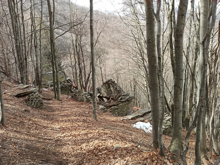 Camminiamo adesso su tanta neve compatta che ci fa pensare alle bellissime sciate in pista che ci siamo persi per colpa del virus maledetto e delle scelte di una politica poco informata in quel di Roma. Seguiamo comodamente la strada per Torcelli, senza bisogno di ciaspole o ramponcini, e, poco prima dell’Alpe, a quota 1400 circa, troviamo il bivio per l’Alpe Casale. Si scende velocemente nel bosco, con neve buona fino a quota 1200 e poi sul sentiero evidente fino ai ruderi dell’Alpe Casale, 1135. A Cascina Vè, 996, c’è un bellissimo chalet in costruzione ed arriva una strada. Niente di strano. Nel bel bosco di faggi arriviamo a Bei, 741, dove ci sfamiamo. Circa due ore dal Lusentino.