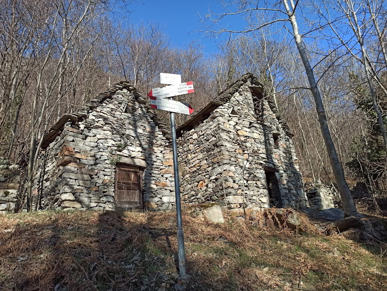 Proseguiamo sulla strada fino a quota 670, dove, sulla sinistra e sotto la strada, parte il sentiero per l’Alpe Termine. Qui giace un palo metallico da cui il vandalo di turno ha divelto scientificamente tutti i cartelli indicatori, compreso quello per la nostra meta. Il sentiero è evidente e segnato, a tratti sporco e abbastanza faticoso, anche grazie al caldo odierno piuttosto imprevisto. Camminiamo adesso in direzione sud ovest.