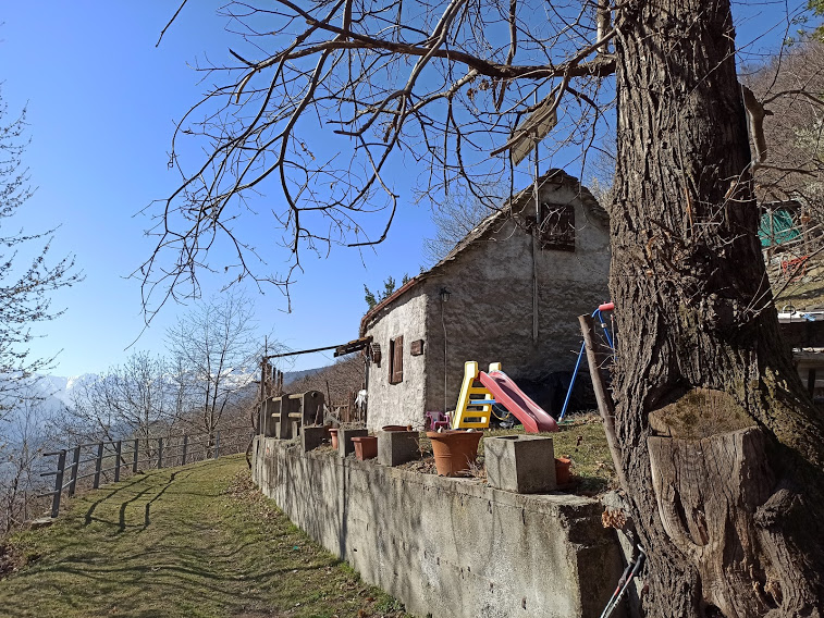 C’è una bellissima baita, direi anzi villa, recintata, oltre a dei vecchi ruderi. Cerchiamo con scarso successo il sentiero che, sempre in direzione sud ovest, sale verso la Colma e l’Alpe Fuori e che avevamo già percorso tranquillamente nel 2010. Rinunciamo e a me non dispiace, visto che ne sarebbe uscito un giro himalaiano, considerando il campo base (Mocogna) molto in basso. In due ore e mezza, lungo il percorso di salita, ritorno con la piccola Asia al campo base, dopo aver abbandonato per strada l’ex alpinista, diretto altrove.