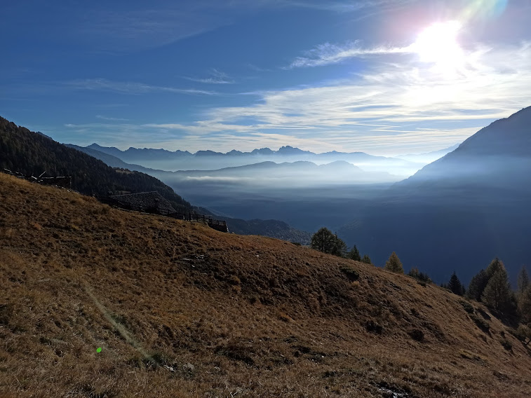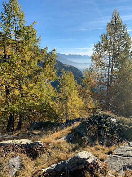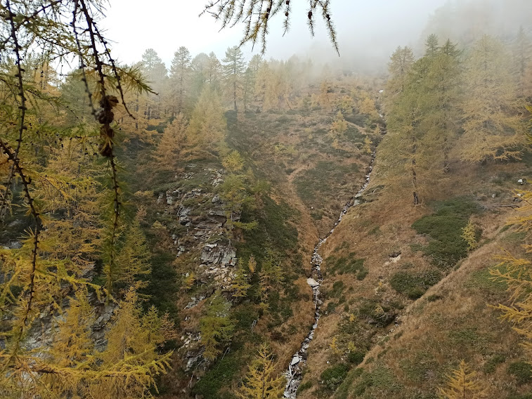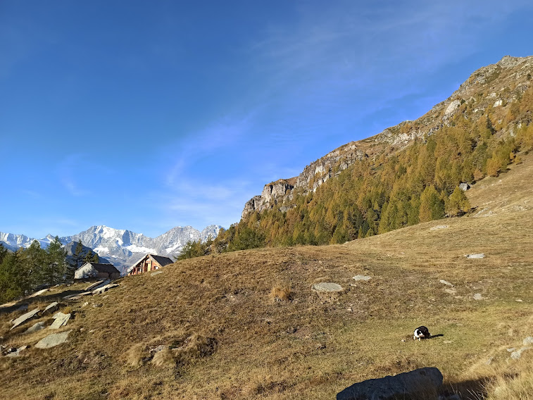 Una volta gli alpeggi erano molto più vivi di adesso e le strade non c’erano. O mi confondo? La pista sale in direzione dell’Alpe Lavazza, ma sicuramente non si fermerà lì: finché c’è salita c’è speranza! Torniamo ad immergerci nei colori dell’autunno lungo il sentiero evidente e piuttosto ripido, ad alto rendimento. Cominciano a farsi vedere l’Andolla, il Fletschorn, i quattromila del Sempione, lo smog a fondovalle. E per tutto il giorno attraverseremo boschi di larici spettacolari. Passiamo dall’Alpe Casalavera, 1549, e dall’Alpe Orzalina, 1696.