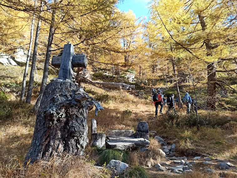 Ci ricompattiamo ed iniziamo la salita “seria”, diretti adesso a nord ovest, incontrando, poco più in alto, il caldo sole di questa magnifica giornata autunnale. Siamo immersi nel colore dorato di vecchi larici che il poeta della montagna Paolo Crosa Lenz chiama “signori dell’autunno”.