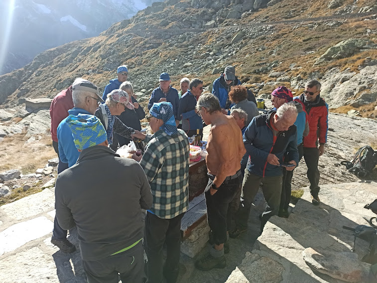 Dispiace per gli amici svizzeri che, comunque, se lo sono già visto su Youtube. Ci portiamo al bivacco dove, sul tavolo in legno all'interno, restano indelebili le tracce, già presenti nel 2014, dell’“ipo-dotato” che ha inciso con un coltello i segni evidenti della sua intelligenza. Al sole, sul tavolo esterno, vengono allestiti i due “aperitivi”. C’è ogni ben di Dio, salumi, formaggi, dolci ed altro.