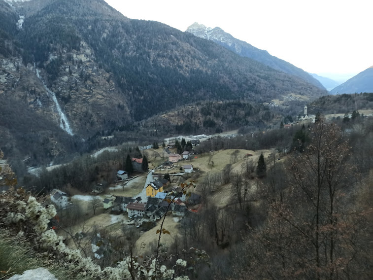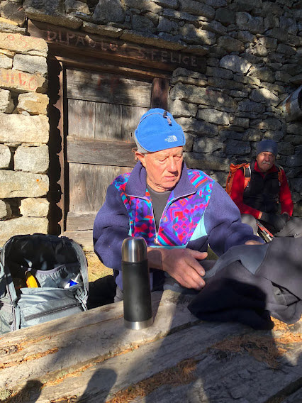 Una signora e sei anziani bevono un caffè a Premia all’alba delle otto e, in auto, salgono alla frazione Albogno, 885. Inutile aggiungere cento metri di dislivello su asfalto a quello che oggi ha già previsto per noi la nostra rocciosa guida walser indigena.