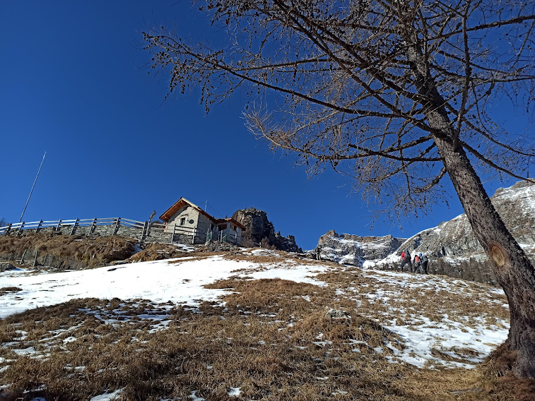 A 1600 incontriamo le prime tracce di neve: che tristezza a metà gennaio! Dopo un’ora e tre quarti, sempre con le ridotte inserite, arriviamo all’Alpe Spotigine (o Spotigene), 1820, dove due amici della nostra guida stanno lavorando ad una bellissima baita. Qui di neve ce ne sono forse venti centimetri, ma solo in ombra e con l’aiuto del vento. Al sole, in tenuta quasi estiva, mangiamo qualcosa con tutta calma.