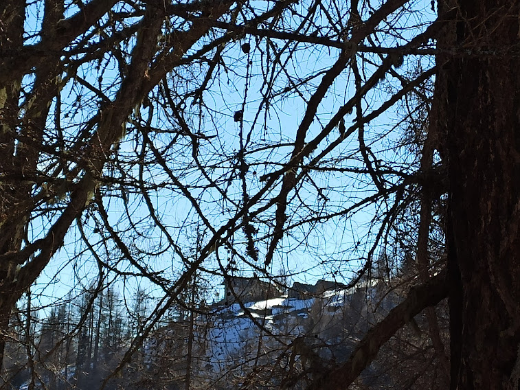 Ci dirigiamo di qui a nord lungo un sentiero non evidentissimo, in leggera discesa, verso quella che per noi è l’Alpe Termine, 1711, La Balma per la cartina. In un tratto in ombra la neve ci fa perdere la traccia e ci abbassiamo troppo. Grazie alla tecnologia ed all’intuito walser recuperiamo il sentiero, dopo aver tribolato per più di mezz’ora su questo terreno impegnativo.