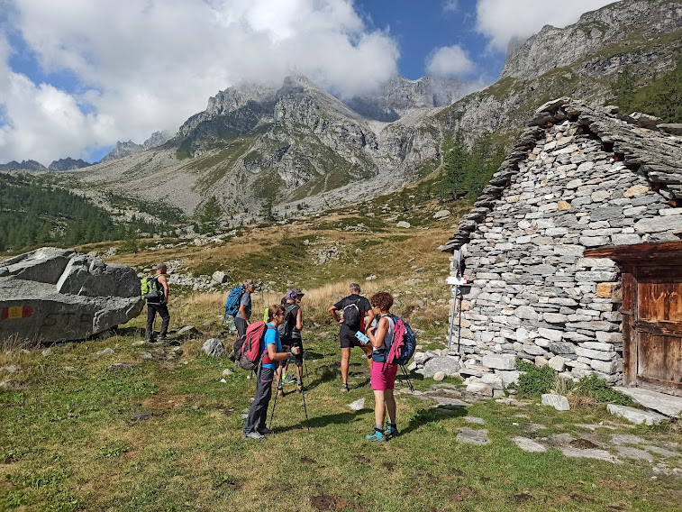 Dopo poco più di un’ora da Buscagna siamo all’Alpe Curt Vita, 2230. La salita riprende seriamente e, in meno di tre quarti d’ora, arriviamo alla Scatta, 2461, e alla Punta d’Orogna, 2474, con il suo grande ometto di vetta di sassi e cemento, passaggio obbligato per chi è diretto all’Alpe Veglia. Ridiscendiamo in zona riparata per la pausa pranzo e poi all’Alpe Curt Vita.