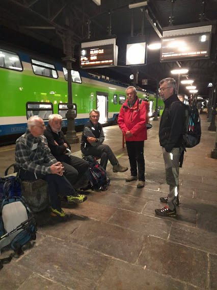 Prima dell’alba ci troviamo alla stazione di Domodossola con zaini e racchette, sotto gli sguardi perplessi di chi le levatacce le fa quotidianamente per andare al lavoro. Anche oggi la squadra tipo è costituita da badante e medico di turno che si occupano di quattro anziani, uno dei quali, oltre al mal d’auto, soffre anche il mal di treno. Se non fosse per l’età avanzata, dovremmo pensare in futuro di raggiungere i campi-base in bicicletta, come spesso facevano i nostri vecchi.