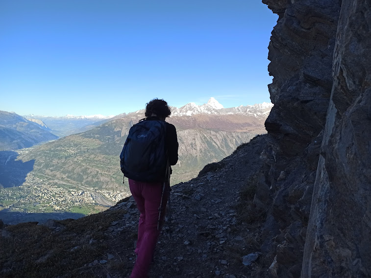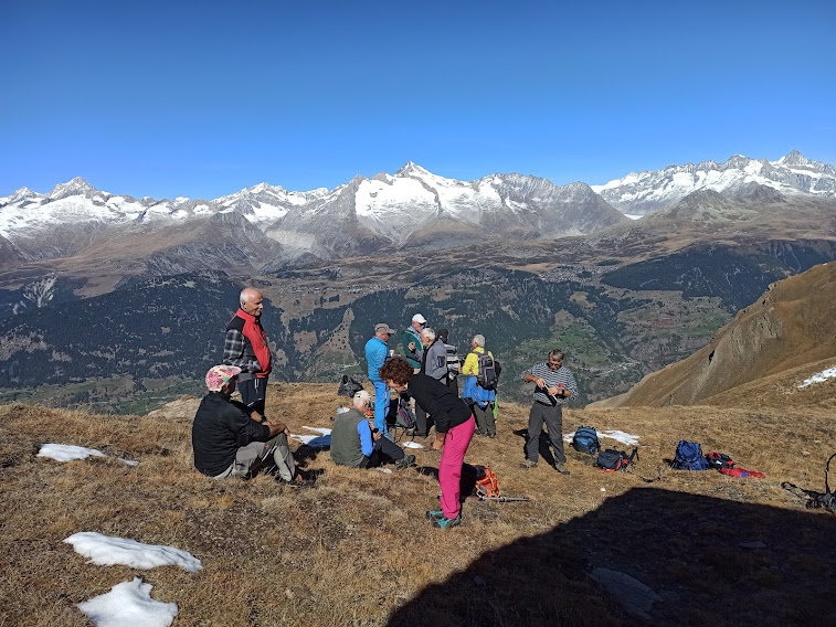Dodici tornanti ci portano in vetta al Folluhorn, 2655, dopo poco più di due ore. Il panorama a 360 gradi è indescrivibile. Per ricordare solo le vette più importanti, passiamo da Finsteraarhorn a Aletschhorn, Nesthorn, Bietschhorn, poi Weisshorn, Matterhorn (Cervino per gli amici), i Mischabel, i quattromila del Sempione e tutto il resto, fino al Cervandone.