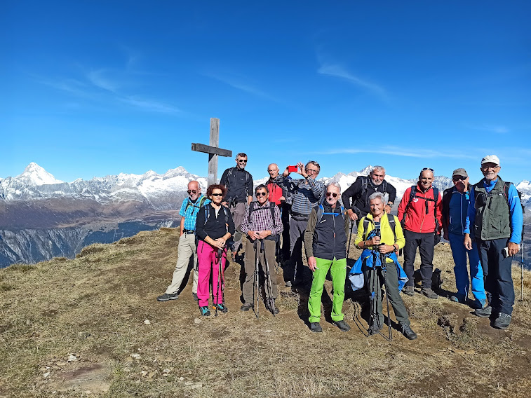 Passando da Saflischmatte e lungo il percorso delle piste da sci, rientriamo a Rosswald, chiudendo l’anello alla chiesetta. In pochi minuti siamo al parcheggio (poco più di un’ora e mezza dal Fülhorn). Nel ristorante vicino alla stazione di valle dell’ovovia che da Ried sale a Rosswald consumiamo quella che per gli amici svizzeri, non per noi, è una modesta merenda. Sul treno che ci riporta in patria studiamo già un percorso adatto all’incontro italo – svizzero del 2023. Siamo ottimisti.