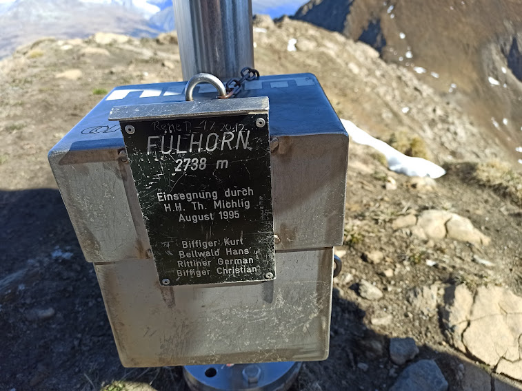 Un amico svizzero, già soddisfatto della cima raggiunta nonostante un ginocchio birichino, ritorna prudentemente a Rosswald dal percorso di salita. Noi proseguiamo verso oriente e, superato un breve tratto scosceso, arriviamo in venti minuti in vetta al Fülhorn, 2738, la Cima Coppi di oggi. Sempre nella stessa direzione, su terreno molto ripido e, a tratti, esposto, arriviamo a delle piccole costruzioni militari, adesso private, in legno.
