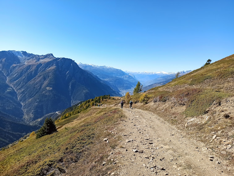 Siamo in ombra e anche la fresca temperatura ci aiuta. Occorre attenzione perché il sentiero è sì bello, ma “traversiamo” su terreno ripidissimo dove uscir di strada è tassativamente proibito. A quota 2300, a Kläna, cominciano finalmente a presentarsi alla nostra sinistra dolci pendii, che prendono il posto dei precipizi rivolti verso Briga. Ci raggiunge anche il sole e sostiamo brevemente. Qui la rotta s’inverte verso sud est, con sentiero e pendenza sempre ottimali.