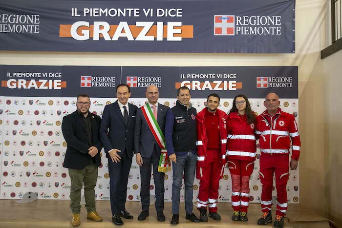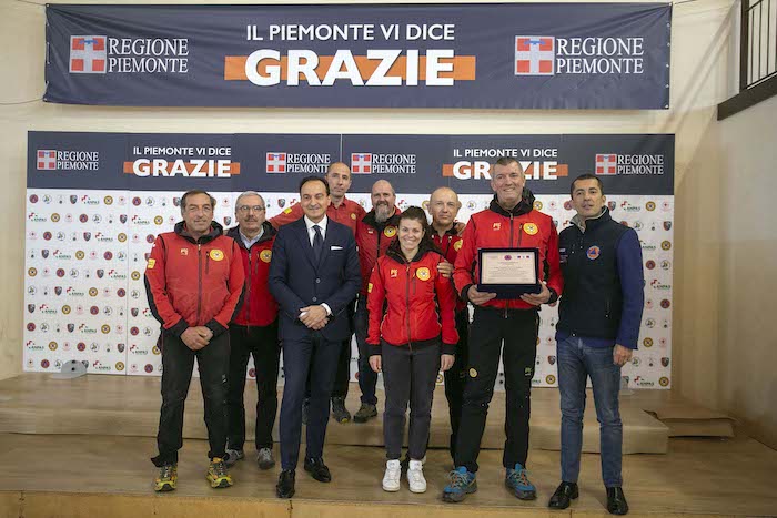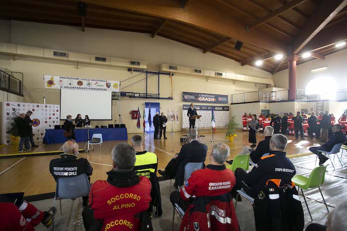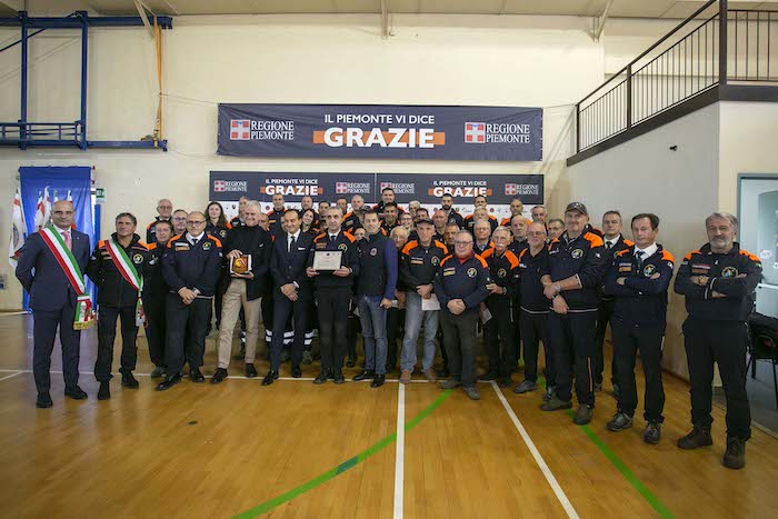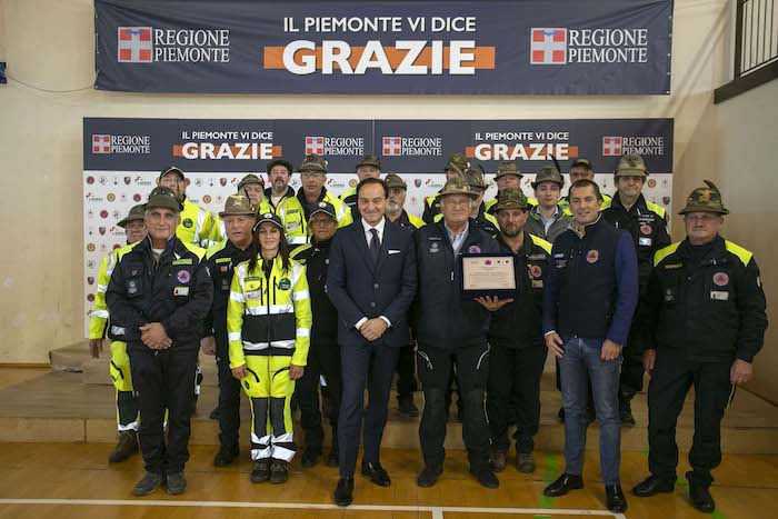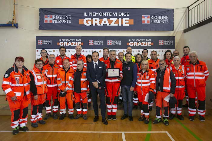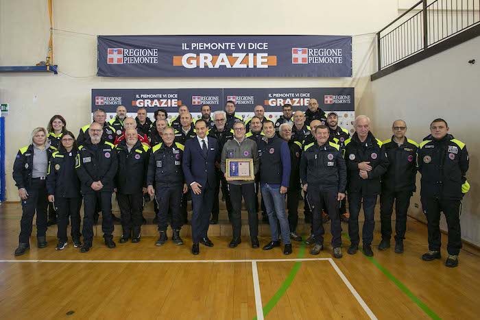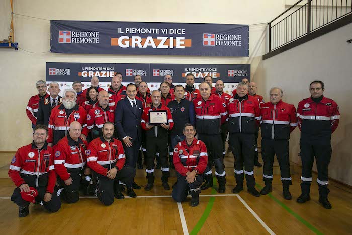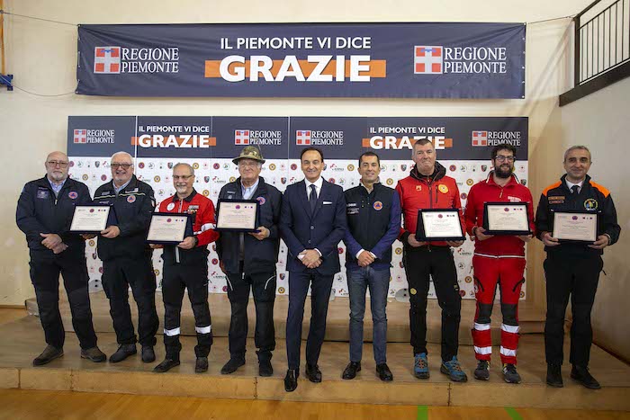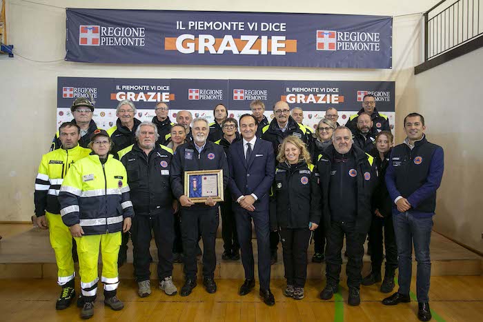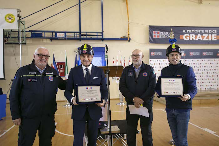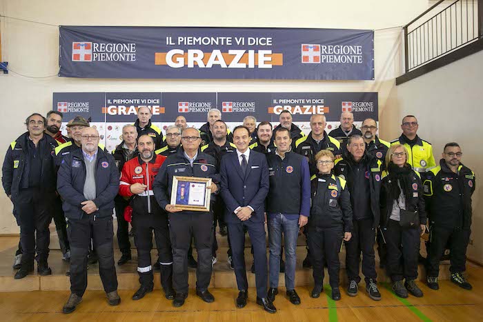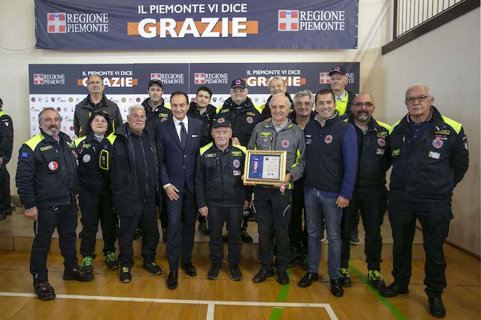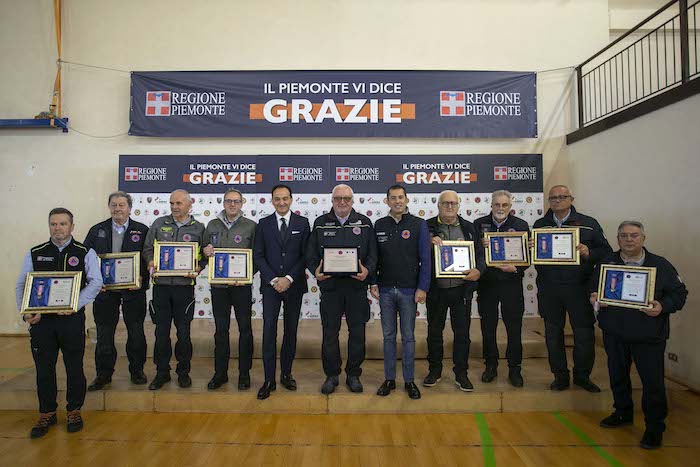 Durante la cerimonia sono state consegnate le targhe di riconoscimento alle competenti regionali e ai loro referenti: Daniele Cora di AIB, Vittorio Ferrero di CRI, Marco Lumello di ANPAS, Marco Lumello di ANC, Luca Gja Arcota del Soccorso Alpino, Giancarlo Bosetti di ANA, Marco Fassero del Coordinamento Regionale Protezione Civile e agli otto coordinamenti territoriali: Andrea Morchio - Coordinamento di Alessandria, Valter Marenco - Coordinamento di Asti, Cleto Canova - Coordinamento di Biella, Roberto Cagna - Coordinamento di Cuneo, Gianfranco Zanetta- Coordinamento di Novara, Leonardo Capuano - Coordinamento di Torino, Francesco Corri Coordinamento di Verbania, Dario Colangelo - Coordinamento di Vercelli.