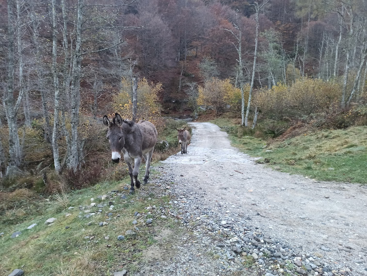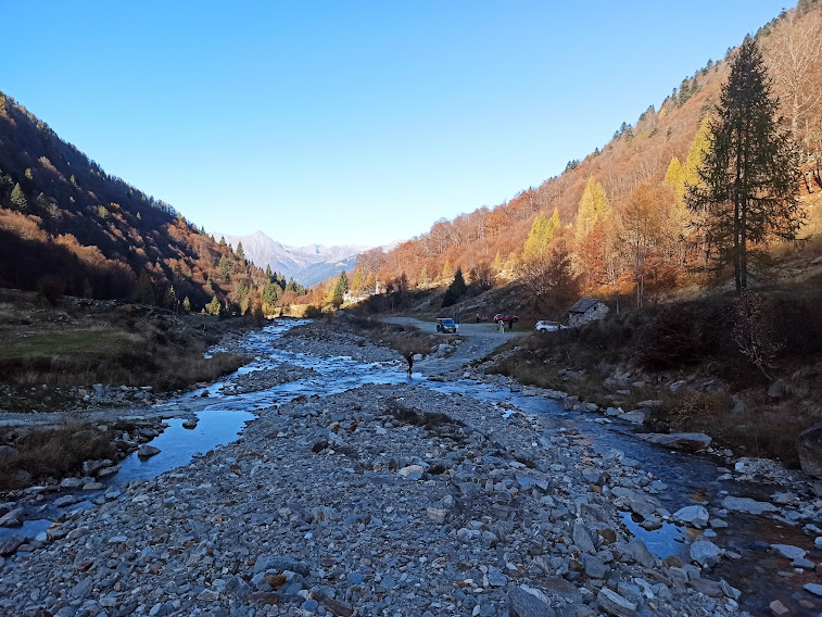 Da quota 980, ancora in ombra ed immersi negli splendidi colori dell’autunno un po’ in ritardo, iniziamo a risalire la Valle del Basso in direzione sud ovest. Due somari ci danno il benvenuto con la loro intelligenza, nettamente superiore a quella dell’homo sapiens che lascia distruggere questi paradisi. Seguiamo la strada e, in parte, il sentiero M10 che, da Malesco, sale alla Bocchetta di Vald. Passiamo dall’Alpe Basso e, a quota 1300, raggiungiamo il bivio per il Rifugio Al Cedo, a destra.