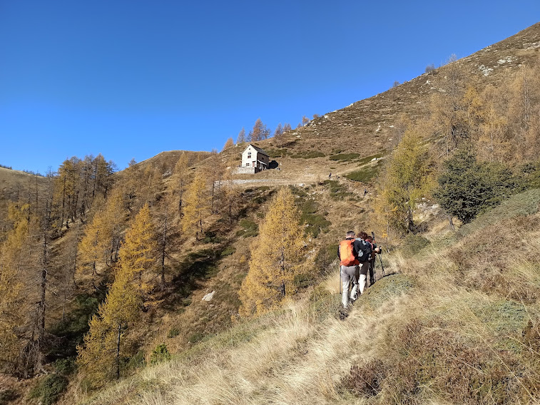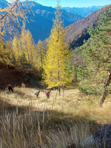 Solito ritrovo a Masera e caffè a Druogno. La giornata è di quelle rare perché un venticello non fastidioso rende l’aria limpida e tersa. Due badanti accompagnano quattro anziani, due dei quali, i più attempati e malconci, fortunatamente seguiti per sicurezza dal medico di turno, saranno in fuga fin dalla partenza, forse per testare le loro tanto precarie condizioni fisiche. Saliamo con le auto appena sopra Albogno e parcheggiamo dove termina la strada asfaltata.