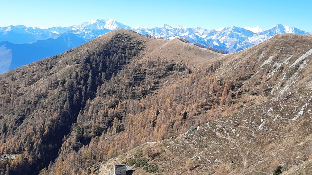 In pochi minuti, lungo la pista trattorabile diretta ad occidente, arriviamo al Belvedere, 1097, degno di tal nome per il panorama verso i quattromila che ci impone già la prima breve pausa. Qui, all’Alpe Piodabella, inizia la fuga dei due anziani acciaccati lungo il sentiero M07, rovinato nel tratto iniziale dalla pista agro-silvo-pastorale e poco segnalato.