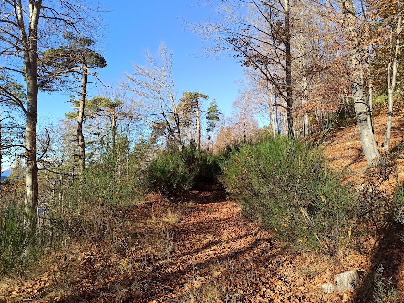 Questa pista era in costruzione circa sette anni fa, quando i Trotapian erano passati da queste parti. La pista “di servizio forestale” ed il suo pesante impatto ambientale erano stati “cofinanziati dall'Unione Europea” per “l'adeguamento della selvicoltura”, più altre belle cose. Allora scrissi: “staremo a vedere”. E oggi vediamo. La strada, evidentemente poco utile, a tratti è quasi scomparsa nella vegetazione. Fare l’indovino su queste cose è fin troppo facile. Ma sappiamo ormai tutti che dalle nostre parti una centralina idroelettrica, un sorriso ed una strada montana non si negano a nessuno. Il contribuente è sempre felice di vedere dove finisce il suo denaro.