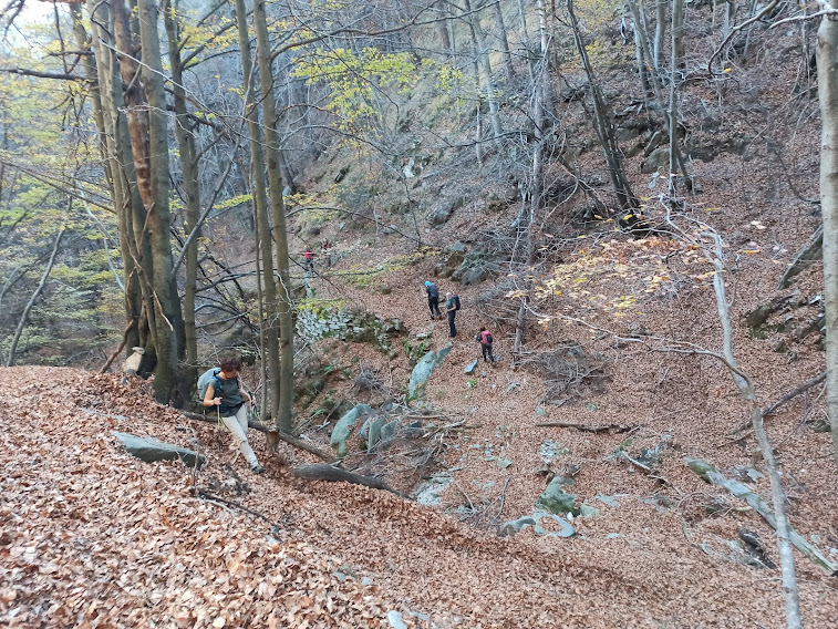 Dopo la pausa pranzo ci abbassiamo su questo sentiero molto ripido fino all’Alpe Gora, 1460, dove si trova una grande baita diroccata. Dovremmo scendere direttamente a Sagrogno, passando dall’Alpe Braghi, ma sotto Gora teniamo la destra seguendo un sentiero evidente, trascurato o maltrattato dalle cartine, e attraversiamo un rio asciutto, che non è il Rio di Albogno.