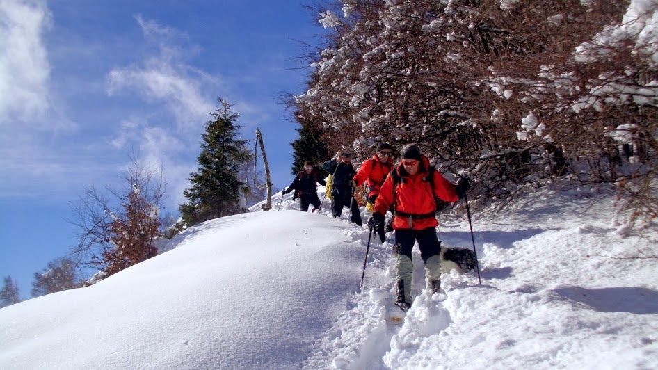 Camminiamo da tre ore e mezza ed il Monte Carza (1116) è ancora lontano. Ci arriviamo dopo altri saliscendi alle 13.45. L’ultimo tratto, fuori dal bosco e, quindi, con ancora più neve, è il più duro: ci si dà il cambio a batter pista ogni 5 minuti. Sembriamo l’esercito napoleonico in ritirata.