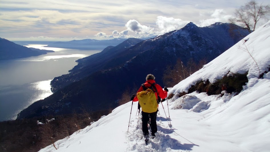Con oltre un metro di neve fresca e pesante, può costituire un problema finire in un buco nascosto dalla neve, se non c’è una mano amica che ti aiuta, ma solo dopo averti accuratamente fotografato. Giovedì 6 febbraio la giornata è stupenda, un breve intervallo fra lunghi periodi di pioggia e neve. Meta sicura e tranquilla è il monte Carza, il più bel punto panoramico sul Lago Maggiore.