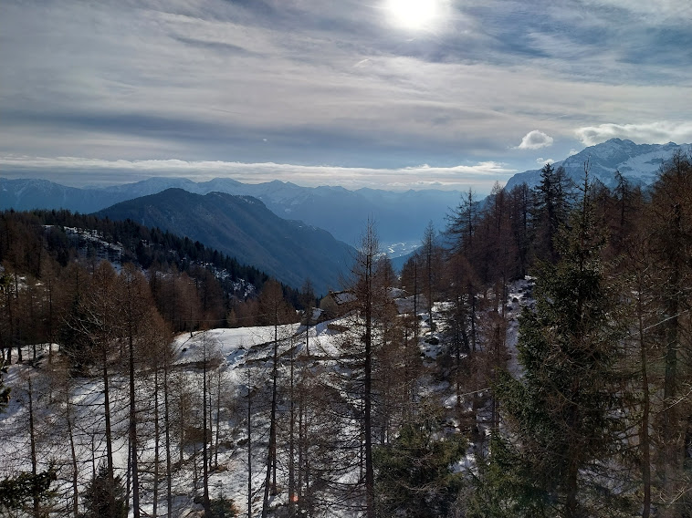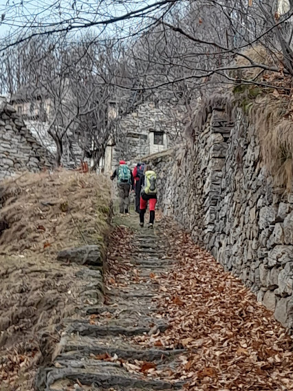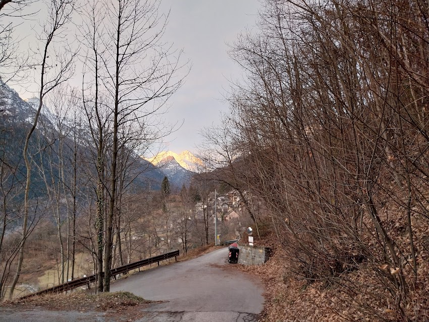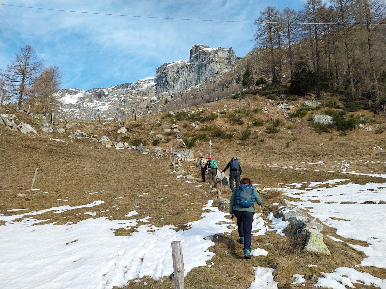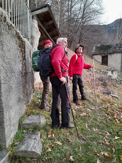 Lei mi ha anche detto, con reciproca tristezza, che gli sci sono un bel ricordo del passato, ma non servono neppure le ciaspole. E stiamo parlando di salire a quota 1750 a fine dicembre, ahimè! Ci troviamo per il solito caffè a Varzo ed ottimizziamo le auto per salire rapidamente a Coggia lungo la stretta stradina asfaltata. Siamo in sei con badante titolare e giovane aiuto-badante francese, medico di turno e tre anziani, uno dei quali in perenne sofferenza.