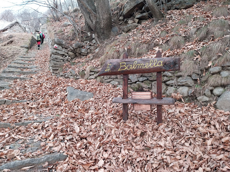 Parcheggiamo dopo il secondo tornante sopra la frazione, a quota 825. Lungo la strada scendiamo al piccolo parcheggio di Coggia e di qui, sulla destra, imbocchiamo la ripida e bellissima mulattiera che attraversa le case, direzione Balmella e Solcio.
