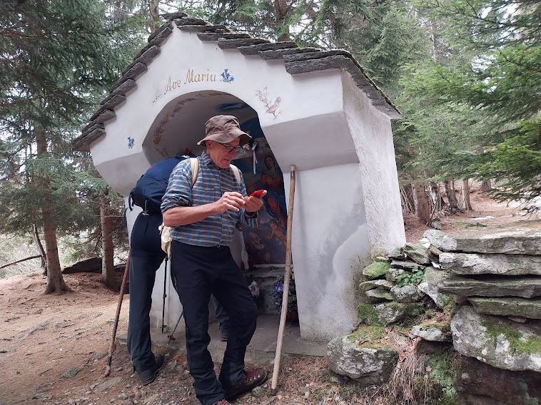 Anziché tenere la destra e ripercorrere il Sentiero dei Cervi, passando da Balmella, proseguiamo diritti, passiamo da Alvazz, sfioriamo un tornante della strada e, dopo Valera, arriviamo a Dreuza, 999. In parte lungo la strada e tagliandone vari tornanti sul bel sentiero arriviamo alle auto sopra Coggia (un’ora e tre quarti).