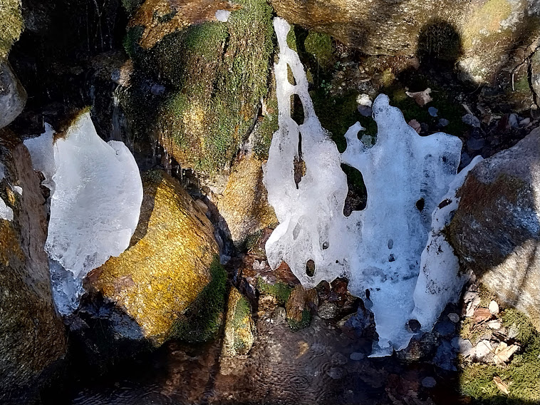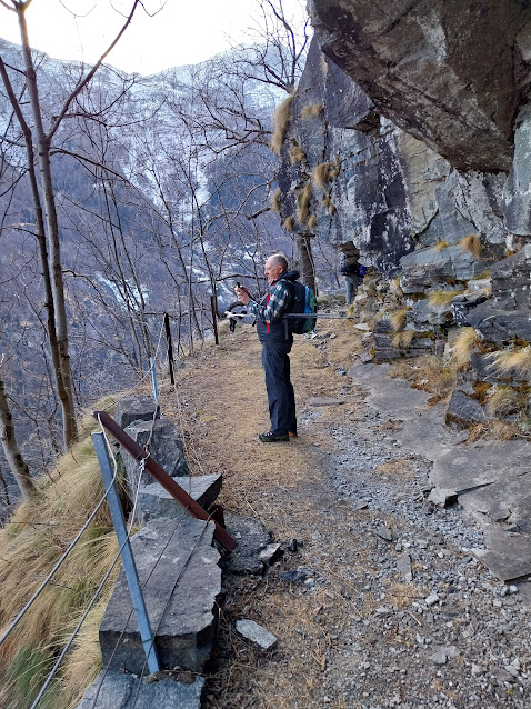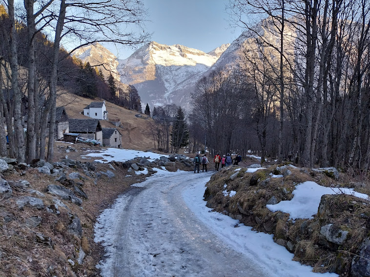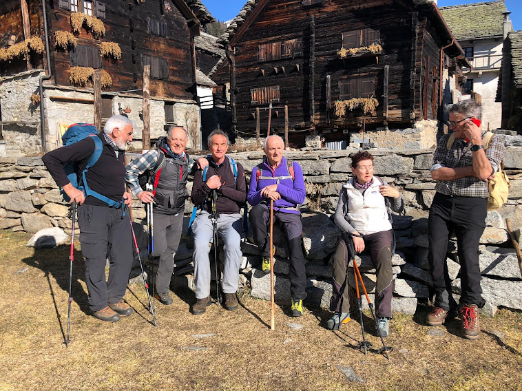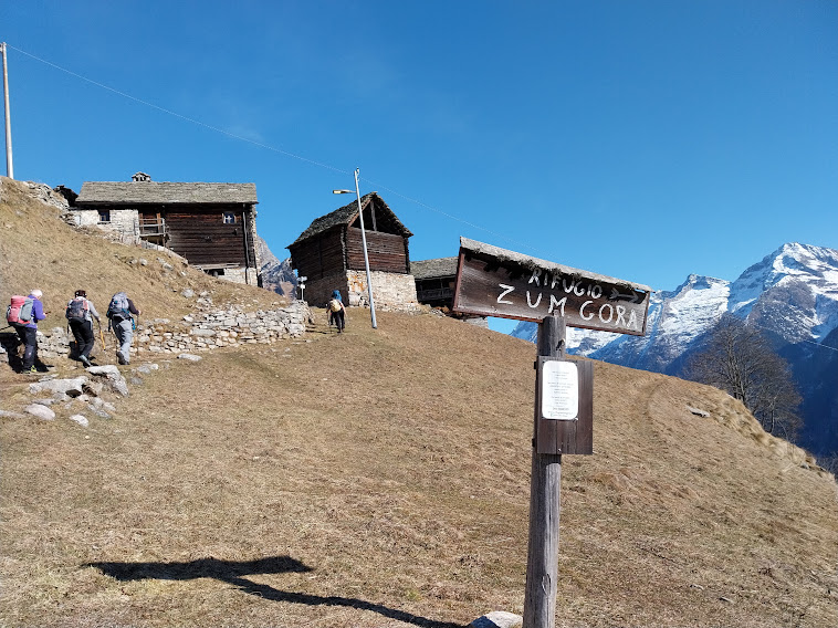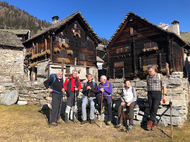 Arriviamo nel meraviglioso villaggio walser di Case Francoli, Frankohus, 1555, e ci godiamo con calma la bellezza del luogo e il panorama. Il padrone di casa, che ci sta aspettando insieme ad un amico, con una telefonata ci “tocca il tempo” e noi acceleriamo. Viriamo a nord ovest ed entriamo nel bosco. Siamo in ombra e troviamo finalmente  un po’ di neve, ma, soprattutto, un tratto di sentiero completamente gelato che ci costringe ad un aggiramento che scalda un po’ i muscoli.