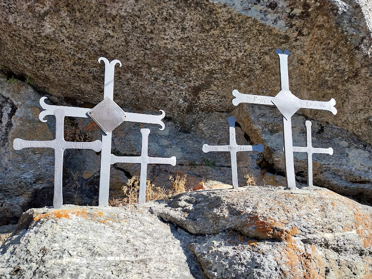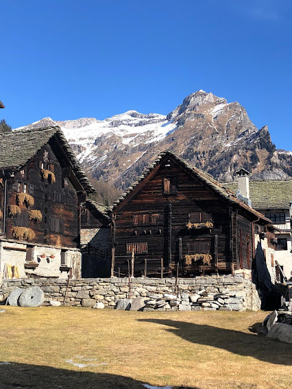 Dopo il severo ambiente, fra enormi strapiombi neri, in cui si è sviluppato il percorso fino a qui, adesso entriamo nel vasto e dolce altipiano di Salecchio Inferiore con le sue frazioni. Siamo alle prime case di Tsu Insglu, nome walser del paese abitato fino agli anni sessanta del novecento, 1322, dopo un’ora e mezza. Oltre la chiesa proseguiamo in piano, verso nord, passando da Gassu e dalla “Scuola Comunale – Virgilio – 1930”. Iniziamo a salire ed incontriamo sei piccole croci in ferro sulla nostra sinistra, ricordi di lontane tragedie.