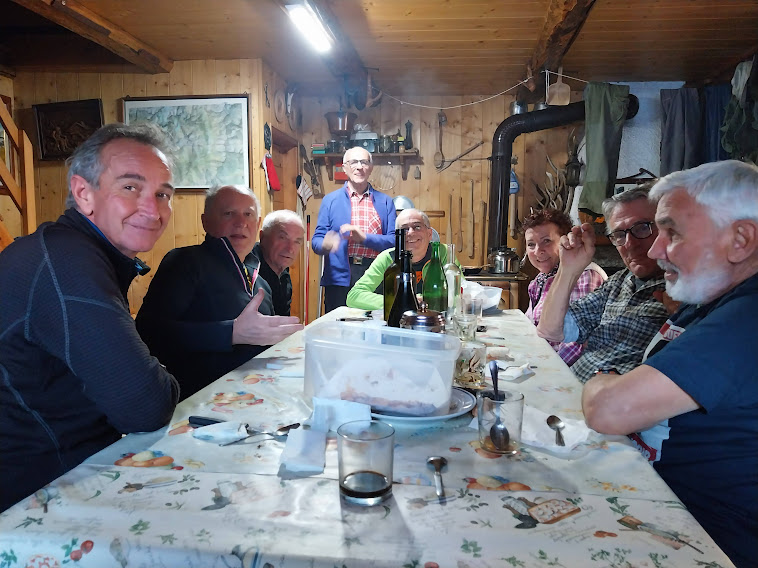 Ci siamo abbassati di circa cinquanta metri per poi risalire, all’alba di mezzogiorno, al Motto, il Mött, quota 1600.  Quasi un’ora e mezza da Salecchio Inferiore. Nella baita del nostro ospite festeggiamo il compleanno di un anziano difficile, quello che richiede maggior impegno da parte delle badanti, ma che oggi è in estasi perché gli ricordiamo i bei tempi dei suoi ardori giovanili, politici e non. Così il tempo vola ed è pomeriggio inoltrato quando lasciamo a malincuore gli amici ed iniziamo il ritorno a valle.