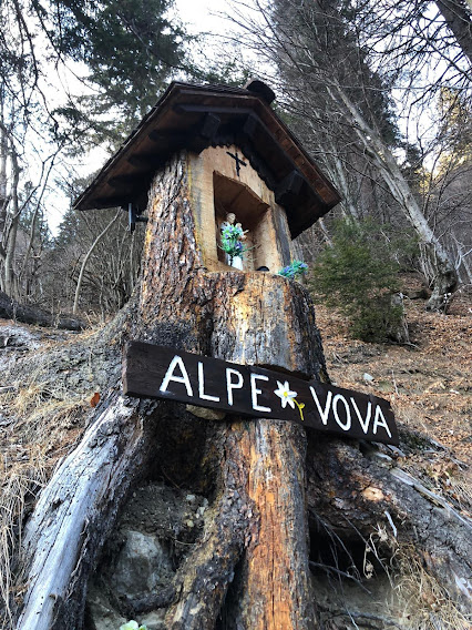 Scendiamo a Vova, 1448, e seguiamo la strada, tagliando diversi tornanti sul bel sentiero. Dopo un’ora e mezza siamo sopra Chioso, a quota 900, dove è parcheggiata l’auto. Veniamo recuperati rapidamente e torniamo a valle con la consueta ricarica di energia positiva per sopravvivere una settimana a fondovalle.