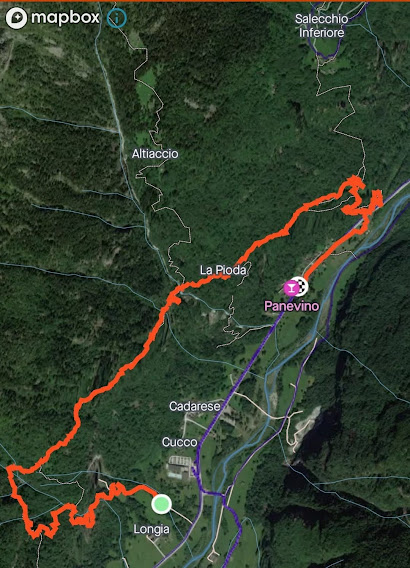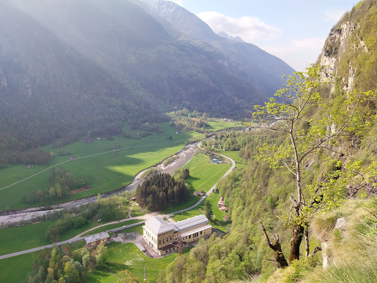 Dopo la Centrale di Cadarese, ENEL Green Power perché una parola inglese fa moda, due poi …., prendiamo una strada a sinistra e parcheggiamo vicino ad una grossa gru, in località Longia, 760. Ci dirigiamo a occidente, lungo la pista che sale dolcemente verso lo strapiombo solcato da una cascata. E noi dovremmo arrivare lì sopra lungo qualcosa che assomiglia a un sentiero? Così dice la guida.