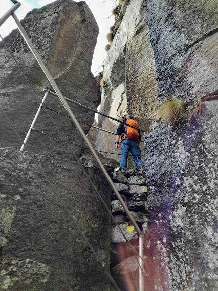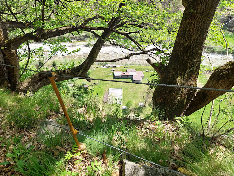 La nostra fede non vacilla e cominciamo a salire in presa diretta, quando termina la pista al disopra un muro ciclopico di enormi blocchi. Un tratto di mulattiera e poi sentiero, più in alto ben attrezzato con gradini scavati nel granito, ringhiere, scalette di ferro. Il tutto a picco sullo strapiombo, ma in tranquilla e totale sicurezza, con bellissimi panorami su Antigorio e Ossola. Sopra il precipizio entriamo in un ripido bosco di faggi ed il tragitto ad alto rendimento ci porta al Bacino (che è nel cuore della montagna) a quota 1200.