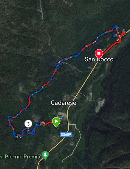 Lungo il sentiero G19a, passando da Ariola, raggiungiamo Bigiogno, 946, per la tranquilla pausa pranzo. Come digestivo mi permetto, da vecchio ex alpinista, di dare una lezione di nodi “vecchia maniera” ad un collega ancor più vecchio. Alla fine mi riesce la famosa vecchia bretella, ma ci impiegò poco di più il grandissimo Uli Steck a scalare in solitaria la Nord dell’Eiger. Di qui si scende decisamente, sempre lungo lo stesso sentiero, percorrendo con attenzione un tratto danneggiato da una frana, dove è stata posizionata una preziosa corda. In breve si raggiunge la SS659 poche centinaia di metri a nord di San Rocco.