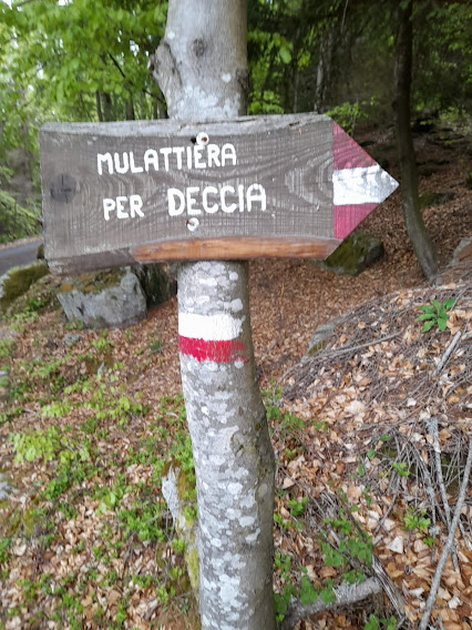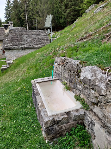 Camminiamo da un’ora e il presidente ci concede una pausa. Sempre sul sentiero passiamo da belle baite ed apprezziamo la solita vasca da bagno che, però, è resa presentabile dal rivestimento esterno in sasso. Attraverso il bellissimo bosco, incrociando una volta sola la strada asfaltata, raggiungiamo le prime baite di Deccia, 1610, dopo poco più di tre quarti d’ora. Una vasca da bagno non rivestita ci riporta bruscamente alla realtà, dopo che quella incontrata più in basso ci aveva illusi.
