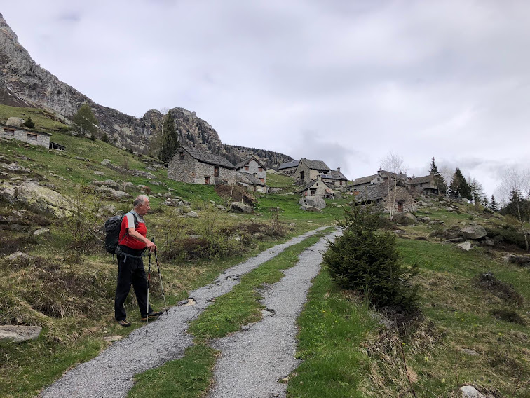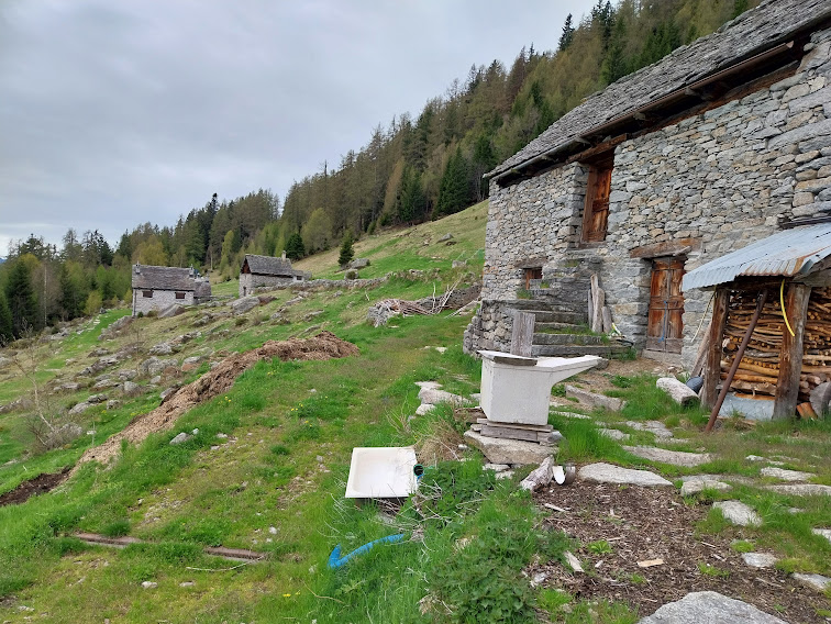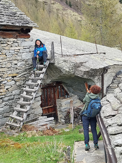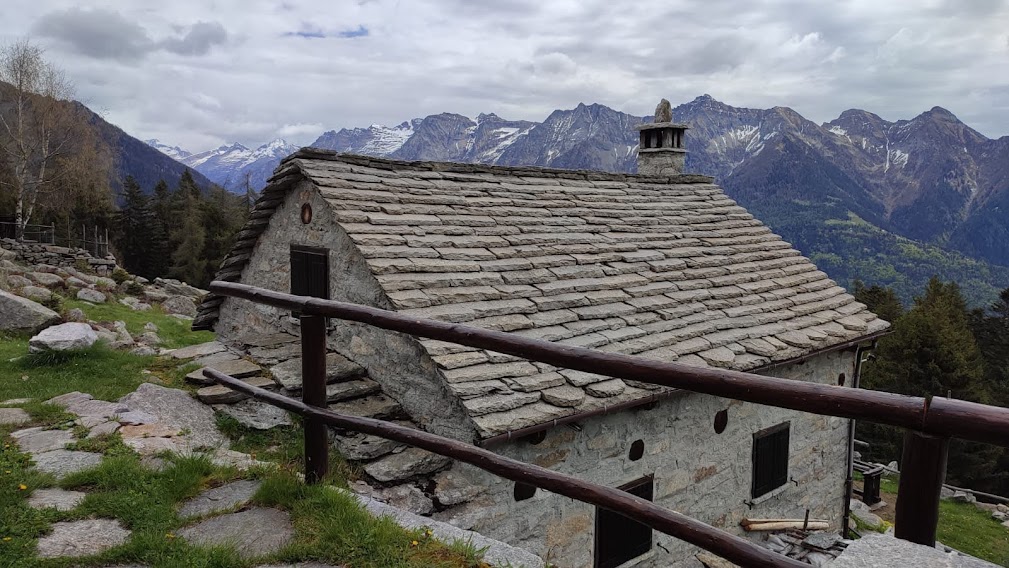 Magra consolazione è l’averne viste anche in alcuni alpeggi della vicina Confederazione. E’ presto, s’intravede qualche raggio di sole, il luogo è stupendo, non siamo stanchi e saliamo in un quarto d’ora fino alle baite più in alto, quota 1694. Qui ci godiamo la genialità delle costruzioni addossate ad un grande masso che fa da parete e da tetto alle baite, nei pressi della simpatica “Via Barbera”.