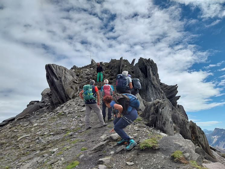 Il sole pallido di oggi non toglie nulla ad un panorama spettacolare. Foto di rito, contemplazione e ripercorriamo la cresta verso occidente ed il tratto ripido, che in discesa richiedono ancora più attenzione. In una bella conca riparata dal venticello frizzante sostiamo per il pranzo. Ripercorriamo il tragitto del mattino lungo il bel sentiero che si potrebbe veramente chiamare l’autostrada delle Alpi, dove incontriamo tanta gente, anche in bicicletta.