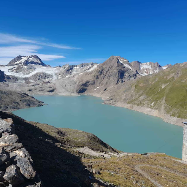 La cattiva abitudine di camminare da solo può essere tollerata oggi con tempo bello stabile e con decine di altri escursionisti su questi percorsi battutissimi. Facendo orgogliosamente parte della categoria dei non raccomandati, mi devo sorbire, sotto il sole del tardo mattino, la salitella alla diga e il lungo tratto pianeggiante che costeggia il lago. Un vento fresco attenua il caldo.