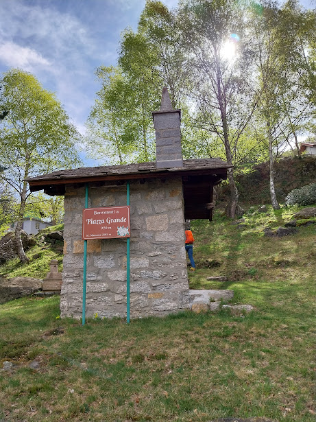 O meglio, questo sarebbe il programma. In effetti il bel sentiero è molto diretto, ripido, con qualche comoda ringhiera e cordina che aiutano l’anziano viandante. Dopo poco più di un’ora da Anzola siamo a Pian Sola, 650, dove viene raccontata la leggenda del Pidèn, l'enorme essere magico che aiutò Dio a completare il mondo e che, cadendo dall'alto, lasciò su uno di questi massi l'impronta del suo sederone. Qui termina la Stra’ Dricia e, fino a pochi anni fa, terminava anche la strada carrozzabile che adesso prosegue fino a Piazza Grande. I criteri costruttivi ormai sono quelli “moderni”, anche se il legname è raccolto e ordinato, mentre il sentiero A33, per ora, è “massacrato” solo in un breve tratto, dove incrocia la strada che, evidentemente, non è ancora ultimata.