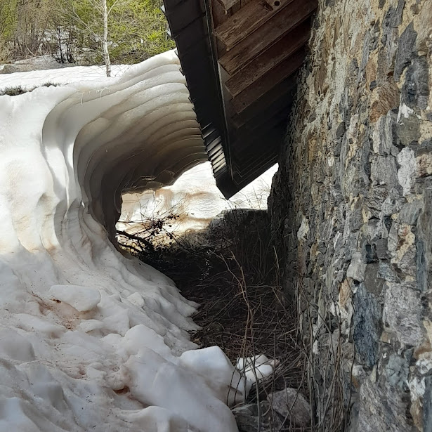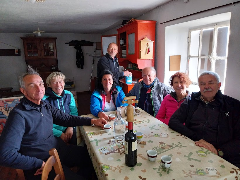 Una grossa valanga fra noi e l’Alpe Drosone Dentro smorza fortunatamente le velleità degli amici e ci fermiamo a pranzare e contemplare al sole, ma non al vento, festeggiando con torta e altre leccornie delle nostre badanti pasticcere il compleanno di una di loro. Durante la discesa ci offre un graditissimo caffè nella sua bellissima baita a La Tagliata una di quelle persone che ti fanno apprezzare ancor di più le bellezze della montagna e della magica atmosfera che la circonda.