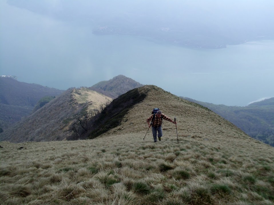 Oggi siamo in sette, con tre rappresentanti dell'INPS ossolana e due dell'INPS verbanese. Due del gruppo, invece, sono ancora in attività, per consentire la nostra sopravvivenza. Poco dopo Cannobio, in direzione Locarno, si imbocca la strada che porta a Sant'Agata, quota 490, bel paese che domina il Lago. Qui posteggiamo e in breve raggiungiamo Cinzago, 501, con il suo caratteristico campanile a sezione triangolare. Nuvole, che più in alto si trasformeranno in nebbie vaganti, mantengono fresca l'aria. Si prosegue, in falsopiano, fino alla chiesa di San Bartolomeo in Montibus, del dodicesimo secolo, immersa in un meraviglioso castagneto, 523 (mezz'ora). Si incomincia a salire seriamente ed arriviamo all'Alpe Pizzocca, 714. Più sopra ecco il grande e ripido prato dell'Alpe L'Agher (mezz'ora). Siamo intorno a quota 1000. C'è un agriturismo e il panorama sul Lago Maggiore è speciale: più si sale, più si estende, più ci lascia a bocca aperta. Contemplandolo, dedichiamo più tempo del solito alla colazione.