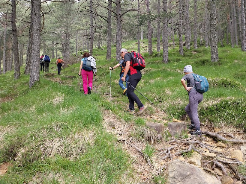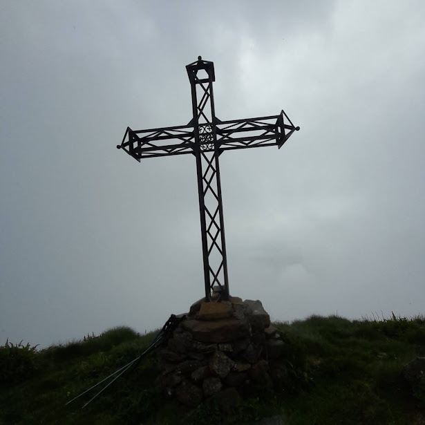 Persino loro “ce la fanno”. Solo l’homo sapiens continua a “non farcela”. Con calma ripartiamo verso la meta, senza grande entusiasmo. Il sentiero S14, diretto a sud, inizia in piano costeggiando per un breve tratto la gippabile che sale dal fondovalle. Sale poi dolcemente nel bosco di faggi, dal quale si passa ad un bosco basso dove trionfa il Pino Mugo. Troviamo una fontana. Proseguendo diritti sul sentiero S14 si salirebbe lungo la via cosiddetta “normale”, percorsa lo scorso anno e che seguiremo al ritorno. Noi teniamo la sinistra ed arriviamo ad un ripiano su cui si trova una baita diroccata: siamo all’Alpetta. Il sentiero non segnalato ma evidente prosegue in leggera salita verso nord est, poi vira decisamente a sud, diventa molto ripido e ci porta alla croce di vetta, 1703 (quasi tre quarti d’ora da Pluni). L’assenza, per ora, di depositi ovini e caprini incoraggia alcuni temerari alla raccolta di spinaci selvatici, mentre riprende a piovere.
