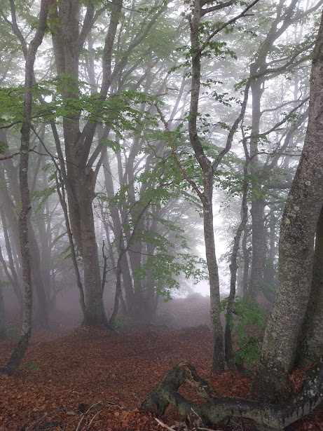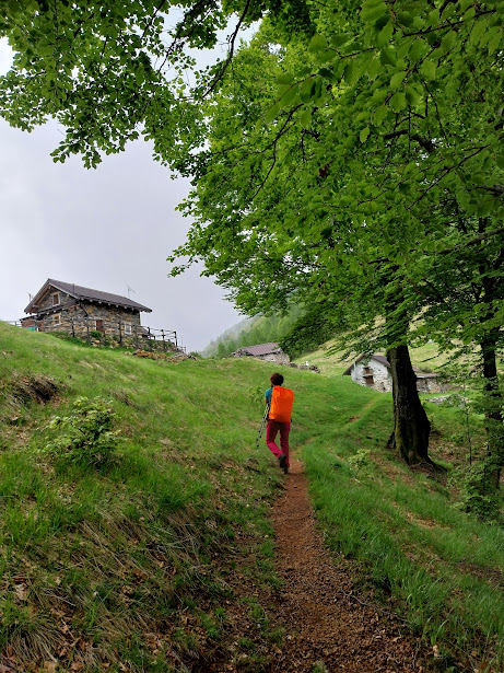 Per fortuna c’è la tecnologia, siamo in tanti, su sentieri evidenti e con molti punti di riferimento. Su terreno diverso, a quote superiori e senza riferimenti, nelle condizioni di oggi la soluzione migliore sarebbe quella di starsene a casa. Adesso è meglio bagnarsi un po’, ma avere le mani libere e rinunciare agli ombrelli. In breve torniamo nel bosco di faggi, sul sentiero S14 al bivio per Monte Vecchio, Cursolo e Orasso, a sinistra.