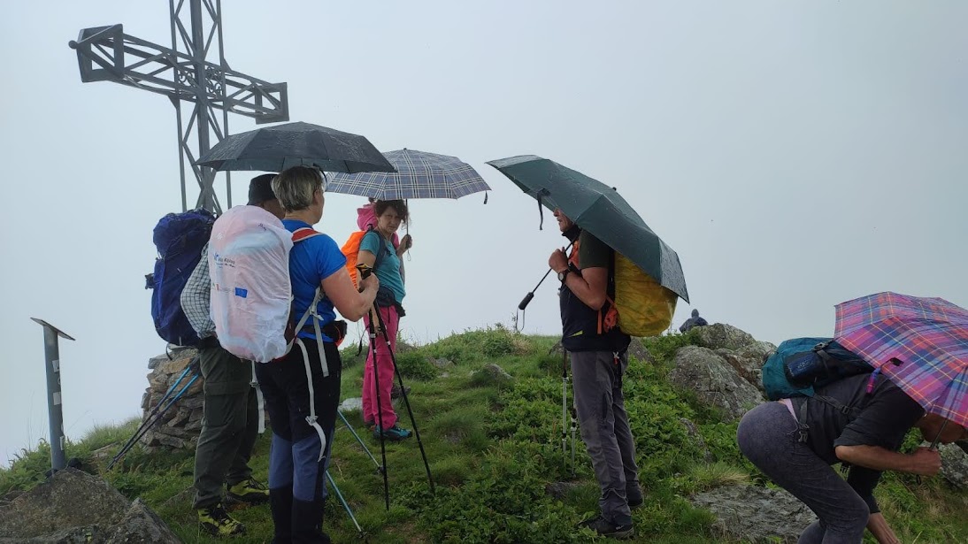 Il libro di vetta è inzuppato d’acqua e inutilizzabile. Su terreno ancora impervio e bagnato iniziamo la discesa sul sentiero S14b verso sud ovest. Parlare di punti cardinali e di orientamento con questa visibilità è facile solo il giorno dopo, in poltrona e con la cartina in mano.