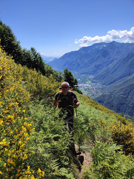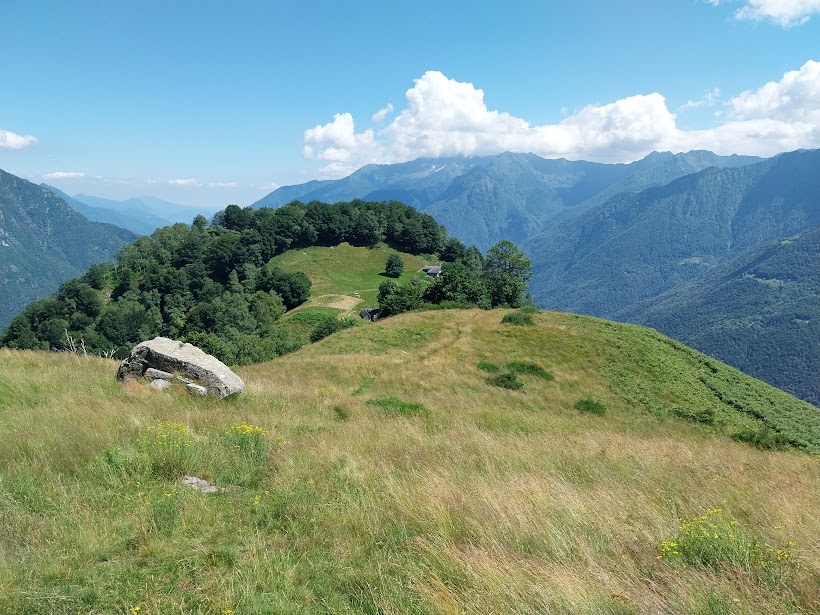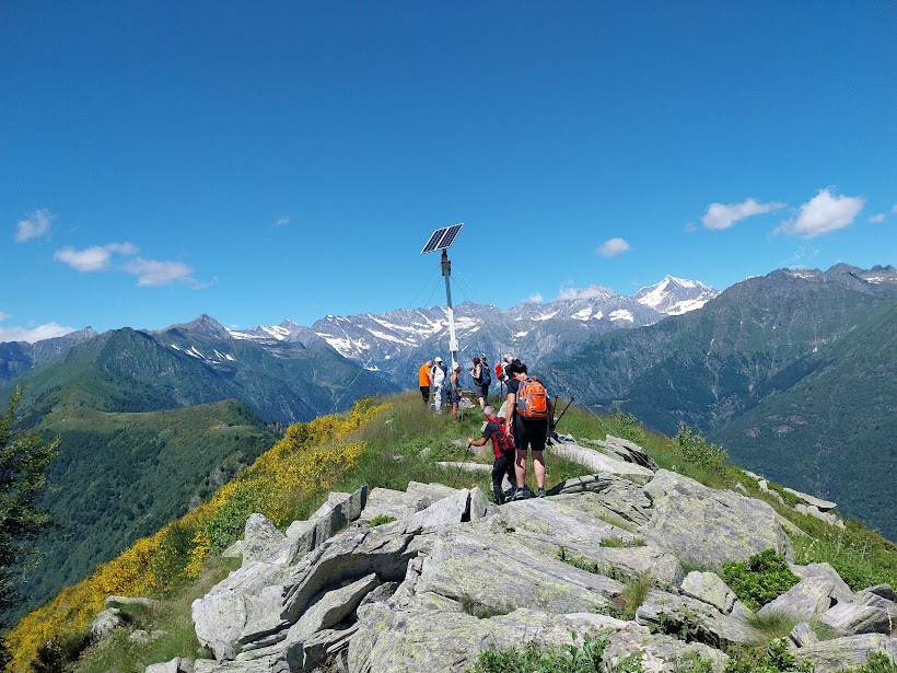 Due giorni prima della gita, che avrei voluto breve e di tutto riposo, il medico di turno che ci accompagnerà mi propone la ripida ascesa al Pizzo Castello, nonostante il mio stato di forma ancora peggiore del solito dopo una vacanza dedicata al cibo e al baby-sitting. Mi promette, il dottore, un passo molto tranquillo ed un’assistenza medica ancora più accurata del solito. Ed è così che cedo miseramente e ci si trova per il caffè a Piedimulera, in una splendida e già calda giornata di luglio. Per fortuna è presente al completo lo staff badanti (quattro), oltre al medico. Si occuperanno di quattro più o meno anziani, uno dei quali al rientro in gruppo dopo una interminabile stagione sci alpinistica. Saliamo a Cimamulera, in località Madonna, 550, minimizzando le auto e posteggiamo. Si sale subito, prima su strada e poi sul ripido sentiero A51, ben segnato fino in vetta. A occidente la Est del Rosa, finalmente bianca come dovrebbe essere sempre un quattromila, domina la scena. Dopo l’Alpe Cascinaccia, 800, passiamo dall’Alpe Sarcera, 886, ed arriviamo all’Alpe Ceresole, 953, dopo poco meno di un’ora. Sostiamo brevemente prima di passare dal fresco del bosco al caldo del sottobosco nel quale camminiamo per una mezz’oretta fino ai bellissimi pianori dell’Alpe Propiano, 1134. Non mi stanco di ripetere che questa dorsale soleggiata fra Ossola e Anzasca è una delle meraviglie del nostro territorio. Oltre ai monti ancora innevati di Anzasca ed Antrona, lo sguardo scorre da nord a sud sul Verbano Cusio Ossola. Dopo il tratto pianeggiante, una leggera salita porta a Propiano Sopra, 1200 circa, ai piedi della Testa del Frate, 1258. A quota 1320, all’Alpe Castello, pausa colazione (mezz’ora). Mentre noi ci godiamo la giornata in compagnia, accumulando energia positiva per la settimana impegnativa che, come sempre, ci aspetta, a brevissima distanza si sta consumando una tragedia assurda. Vediamo un elicottero che vola dalle parti dell’Alpe Droccala, ma sapremo solo alla sera della giovane madre caduta da una teleferica sotto gli occhi della famiglia. Si tira il fiato prima del ripido tratto nel bosco di faggi, dal quale si esce attraversando in direzione nord ovest l’erto pendio, in mezzo ad una splendida fioritura di ginestre. In poco più di mezz’ora, preceduto di poco dai pazienti amici sempre in gran forma, sono in vetta, 1607. Anche qui la grande croce di vetta illuminata di notte grazie ai pannelli solari. Il sole “picchia” davvero, ma l’arietta fresca del Rosa ci consente di pranzare anche senza ombra. La pausa è lunga. Qui non ci si stanca mai di guardarsi intorno. Quando si parla del ritorno, vista l’ora e le promesse fatte all’anziano grafomane, si opta per la via più breve che è quella percorsa in salita. Un’altra lunga pausa all’Alpe Castello e poi Propiano, Ceresole, Sarcera. Cascinaccia e Cimamulera (due ore). La reidratazione doverosa, come sempre da queste parti, è al bar di Piedimulera.