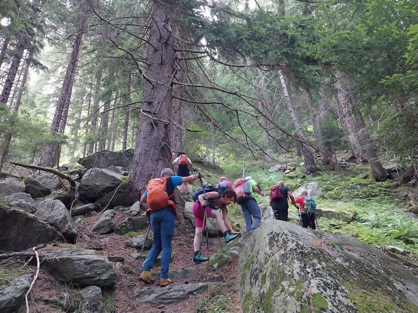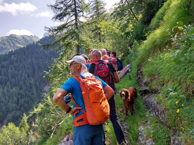 Durante le operazioni di ripresa del cammino riesco a farmi pungere da una malevola vespa di terra ed evito il resto dello sciame grazie al prezioso consiglio di un anziano saggio (“vegn via da lì”!). Vengo anche soccorso dallo staff badanti, simulando una non ben precisata allergia al veleno dei perfidi insetti per godere delle loro delicate attenzioni. Salvato il grafomane, il gruppo riprende il cammino verso valle lungo il percorso di salita.