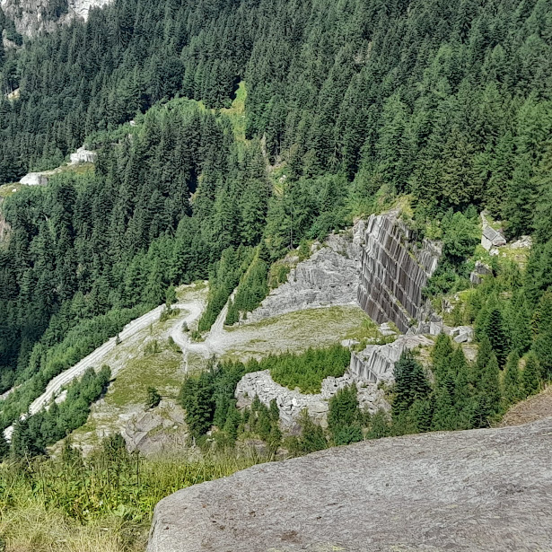 Si potrebbero però conciliare queste esigenze con quelle degli escursionisti: ci sono tanti buoni esempi in tal senso. A tratti si riconosce una vecchia bellissima mulattiera. Si torna sulla strada e si raggiunge un bivio a quota 1300 circa: a sinistra si va alla cava, a destra un cartello indica “Bivacco Cramec” e noi prendiamo questa direzione, sempre su strada. Dopo quasi un’ora di cammino siamo alla vecchia cava, dismessa da tempo, che forma adesso un maestoso anfiteatro naturale.