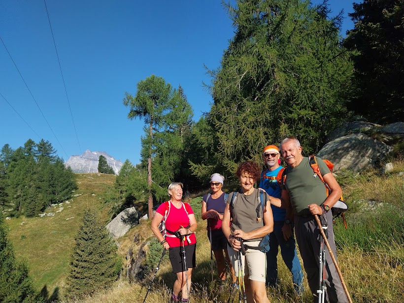Un altro giovedì in Paradiso, nonostante i nostri peccati. A Corte Verde una freccia rossa su un sasso e la scritta “Nava” ci ingannano. Teniamo la destra seguendo un sentierino che, più in alto, si perde in uno splendido e ripido bosco di larici. Dopo rapide consultazioni prevale la saggezza della nostra età media elevata (escluse naturalmente le badanti) e torniamo a Corte Verde. Abbiamo perso quasi un’ora, ma in questa meravigliosa giornata va bene anche un approfondimento delle nostre conoscenze di un territorio nuovo e di grande bellezza.