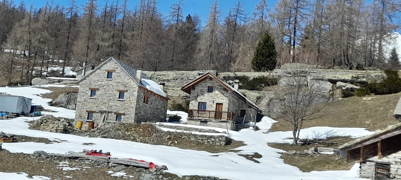 Qui il consiglio dei giorni scorsi di calzare scarponi “da neve” risulta prezioso, anche se da Domodossola non se ne vedeva traccia. Si deve battere pista in quasi mezzo metro di bianco mantello e, di fianco ad una baita, finalmente ci sfamiamo, crogiolandoci al sole. Dopo pranzo passiamo dalla neve marcia alla neve battuta della strada che scende all’Alpe Onzo e ne percorriamo il primo tratto fino a quota 1300 (siamo su un versante nord est, ancora poco soleggiato). Finita la neve, torniamo sul sentiero e si accorciano i tempi. Dopo un’ora e mezza arriviamo all’Alpe Onzo, 811.